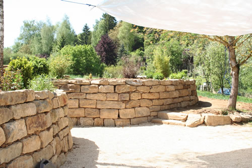 Schwerpunkt: Wirkungsvolle Umgestaltung eines Hügels in Rottenburg, BW, durch Einbau einer ebenen Fläche mit trichterformigen Mauer zur Hangbefestigung aus Abbruch-Naturstein.